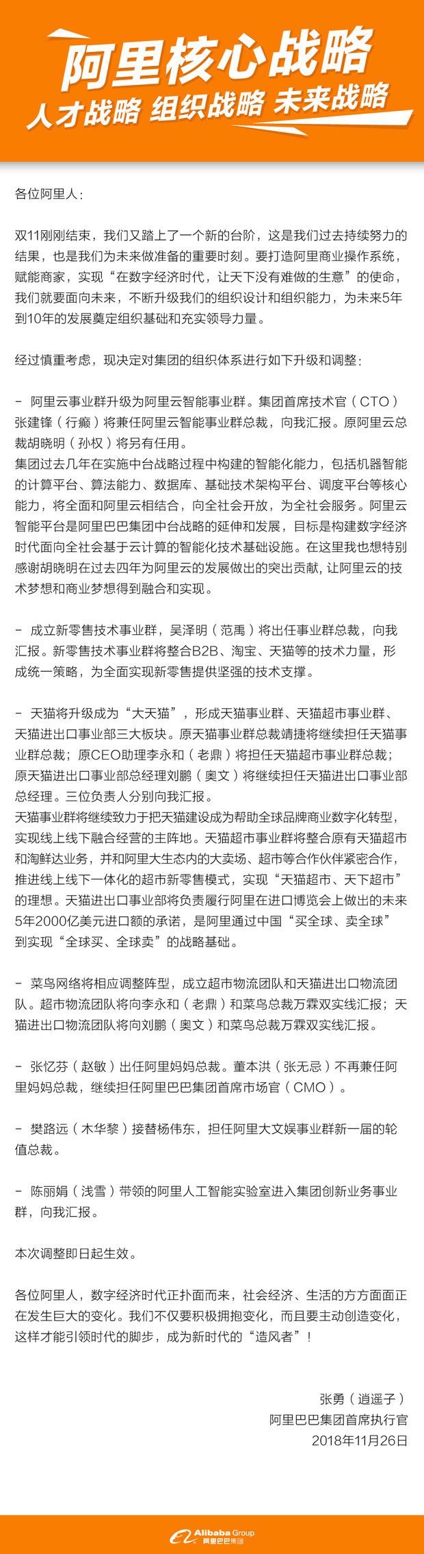 今天中午,阿里巴巴集团 CEO 张勇发出全员公开信,宣布阿里最新一轮组织升级,表示要「为未来 5 年到 10 年的发展奠定组织基础和充实领导力量。」