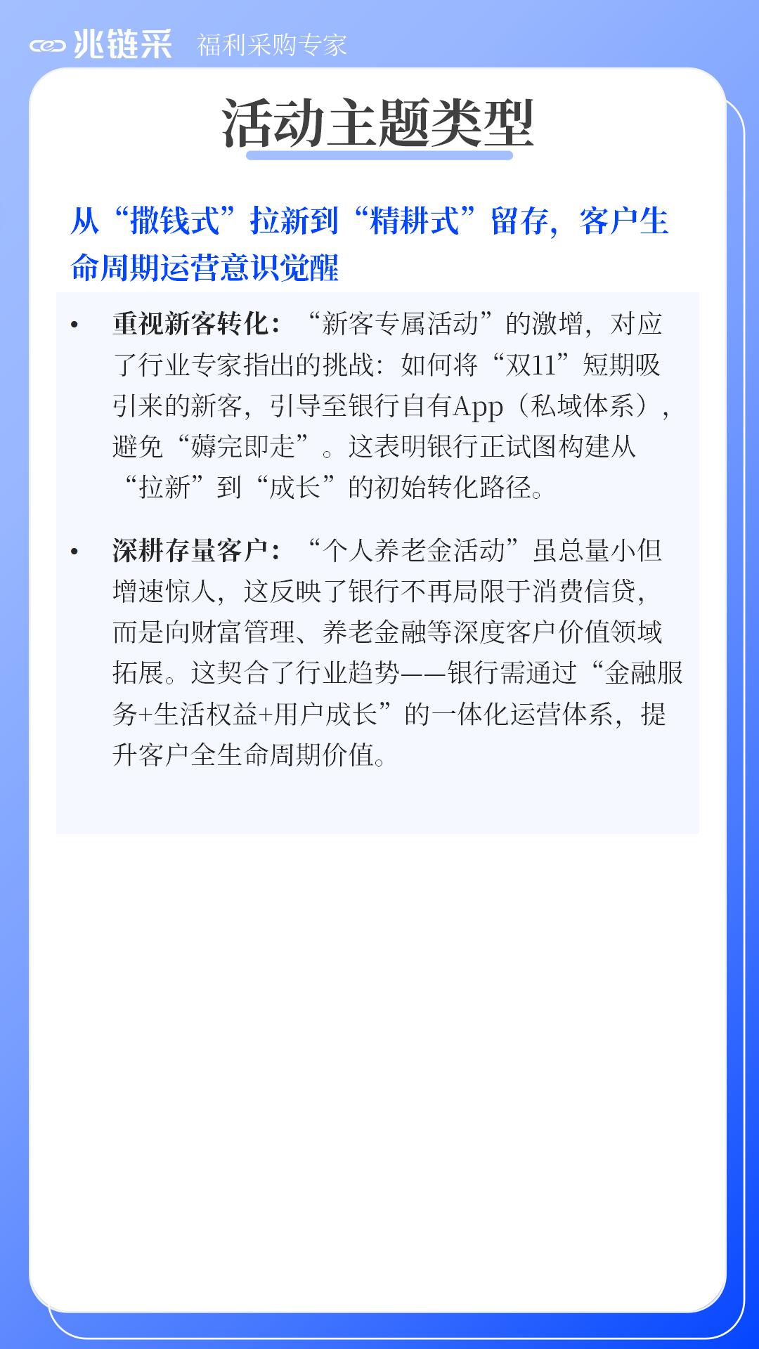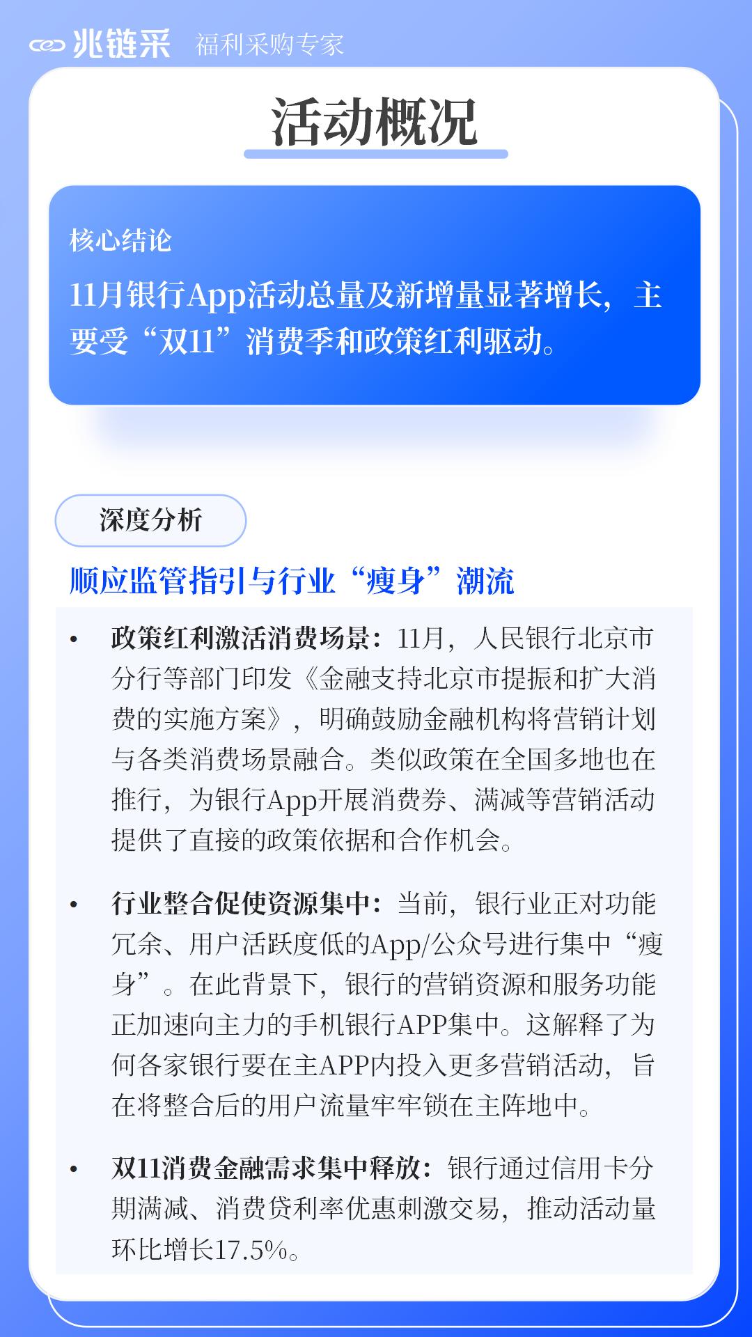11月银行App活动总量环比增长17.5%,新增活动增速达40.3%。数据背后,行业正呈现三大关键趋势: